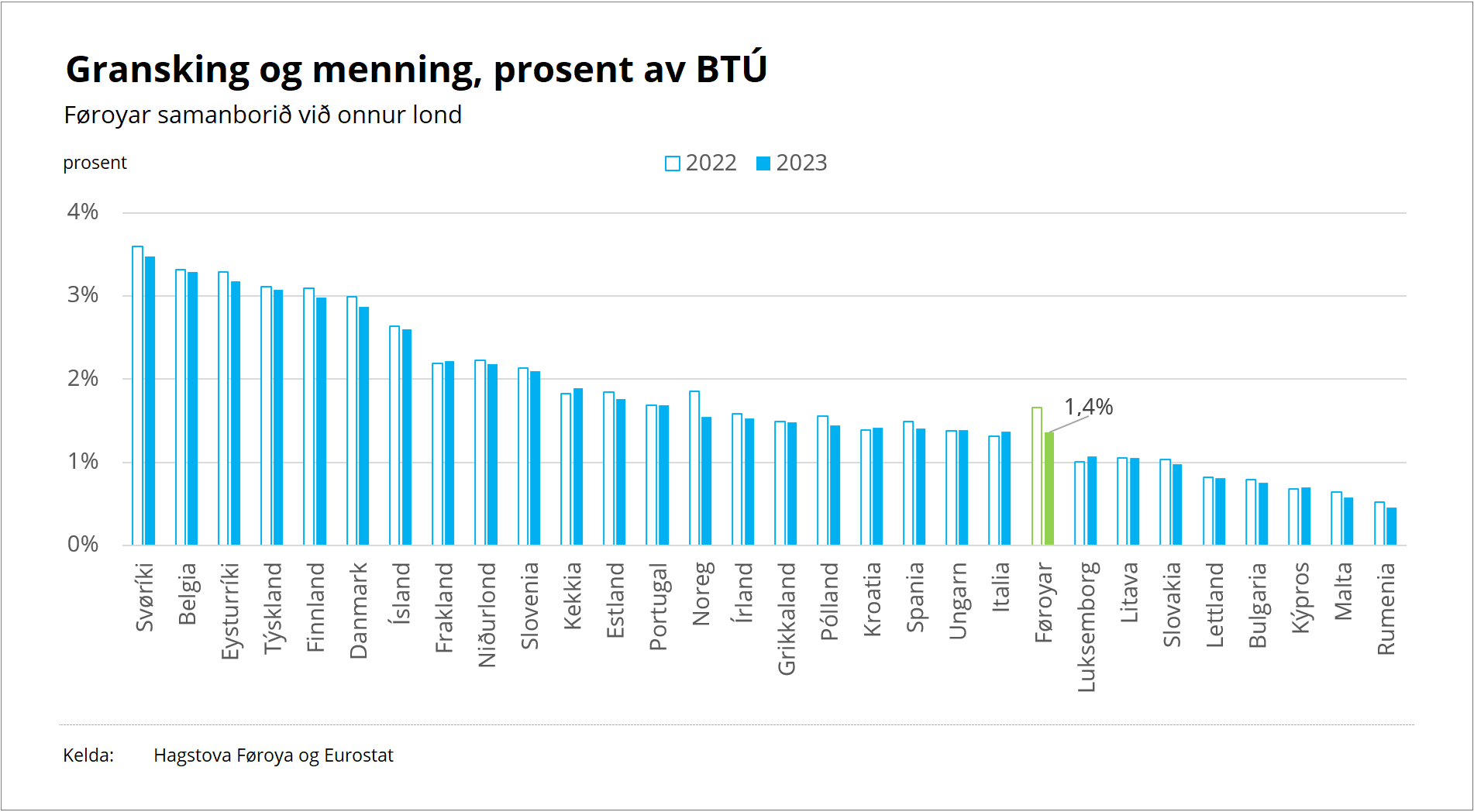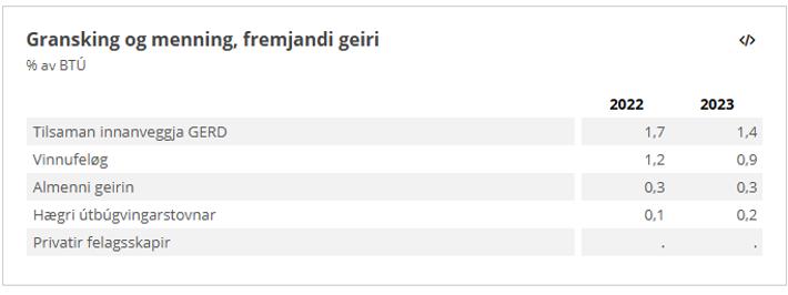 Føroyskir stovnar og fyritøkur brúktu í 2023 tilsamans 367 milliónir kr. til gransking og menning. Tað svaraði til 1,4 prosent av BTÚ og er sostatt 0,3 prosentstig minni samanborið við árið fyri, tá granskað og ment varð fyri 1,7 prosent av BTÚ.